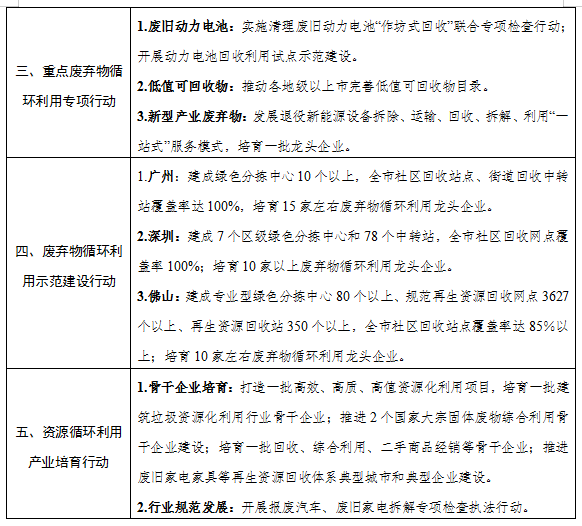 (十三)推动产业集聚发展。高水平建设现代化“城市矿产”基地和循环经济产业园区,引导废弃物循环利用企业、搬迁改造项目向园区集聚。深入推进广州、深圳、佛山等废旧物资循环利用体系重点城市和韶关、云浮等大宗固体废弃物综合利用示范基地建设。建立健全区域废弃物协同利用机制,以五大都市圈为重点布局建设区域性废弃物循环利用重点项目。引导现有生活垃圾处理企业或园区利用现有场地资源,构建废弃物精细化回收、精细化分拣、高水平循环利用产业链条。