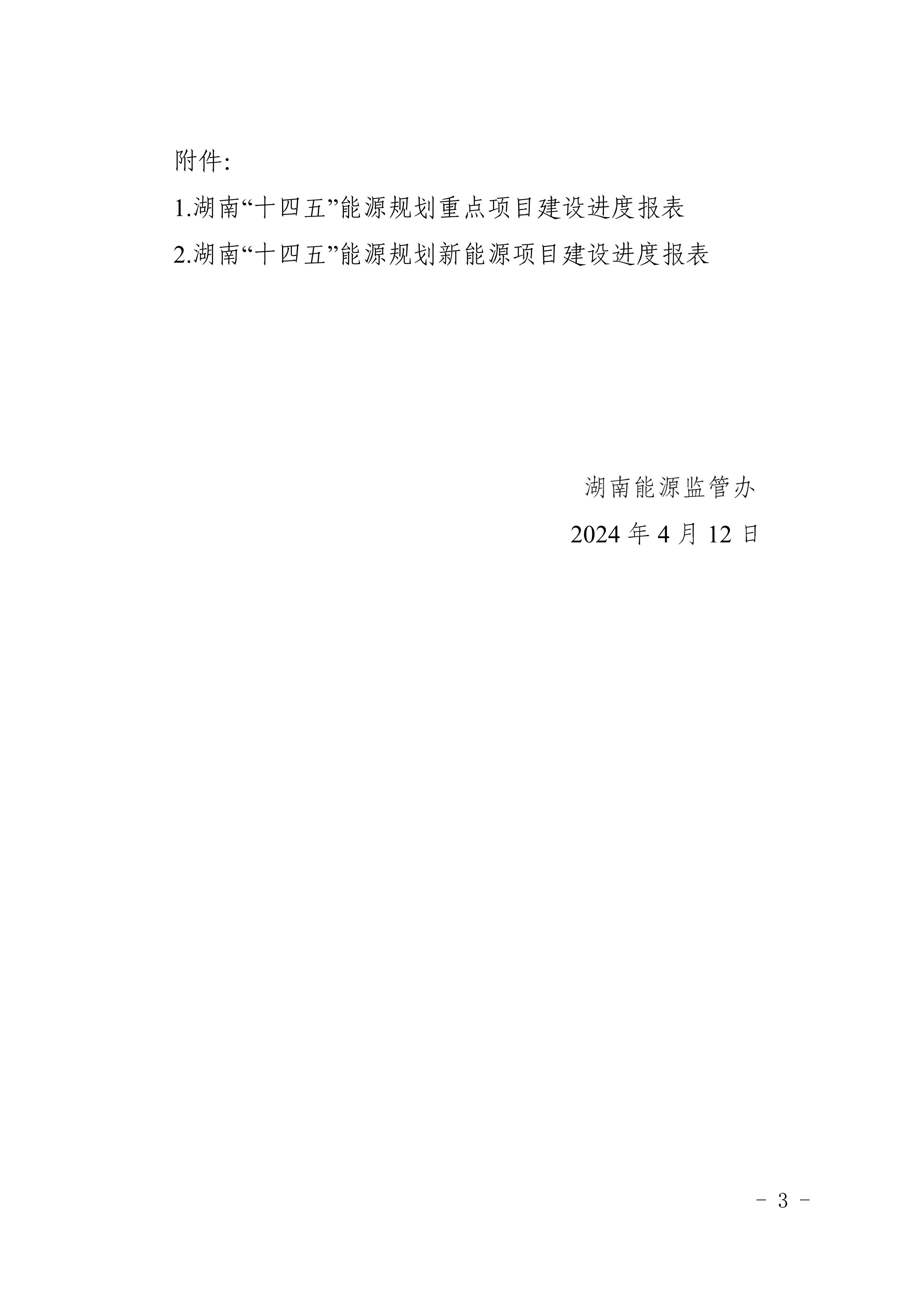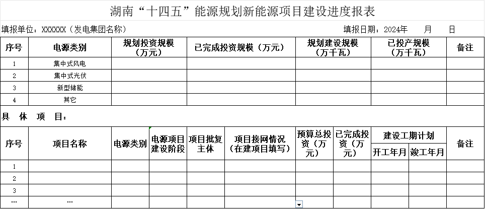 根据国家和湖南省“十四五”能源规划,我办设计制作了湖 南“十四五”能源规划重点项目建设进度报表(附件 1)和湖南 “十四五”能源规划新能源项目建设进度报表(附件 2)。各有 关单位要严格落实《电力企业信息报送规定》等政策要求,于每 月 5 日前,及时准确填写报送项目建设进度报表。我办通过现场 和非现场核查等方式,对信息报送情况进行监督检查,对瞒报、 虚报、迟报等情形按规定予以查处。