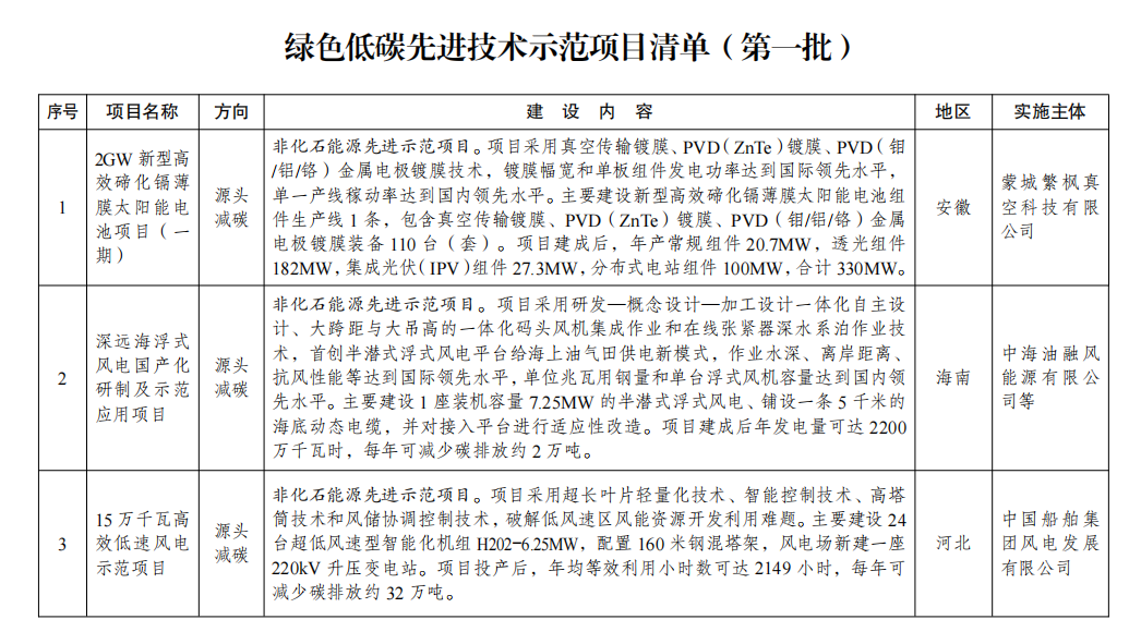 为贯彻落实党中央、国务院决策部署,加快绿色低碳先进技术示范应用和推广,按照《绿色低碳先进技术示范工程实施方案》(发改环资〔2023〕1093号)工作部署,我委会同有关部门组织开展了第一批绿色低碳先进技术示范项目申报遴选工作。经项目单位申报、地方审核推荐、第三方机构评审、部门及地方复核、公开征求意见等遴选审核程序,确定了第一批示范项目清单,现予公布,并就有关事项通知如下: