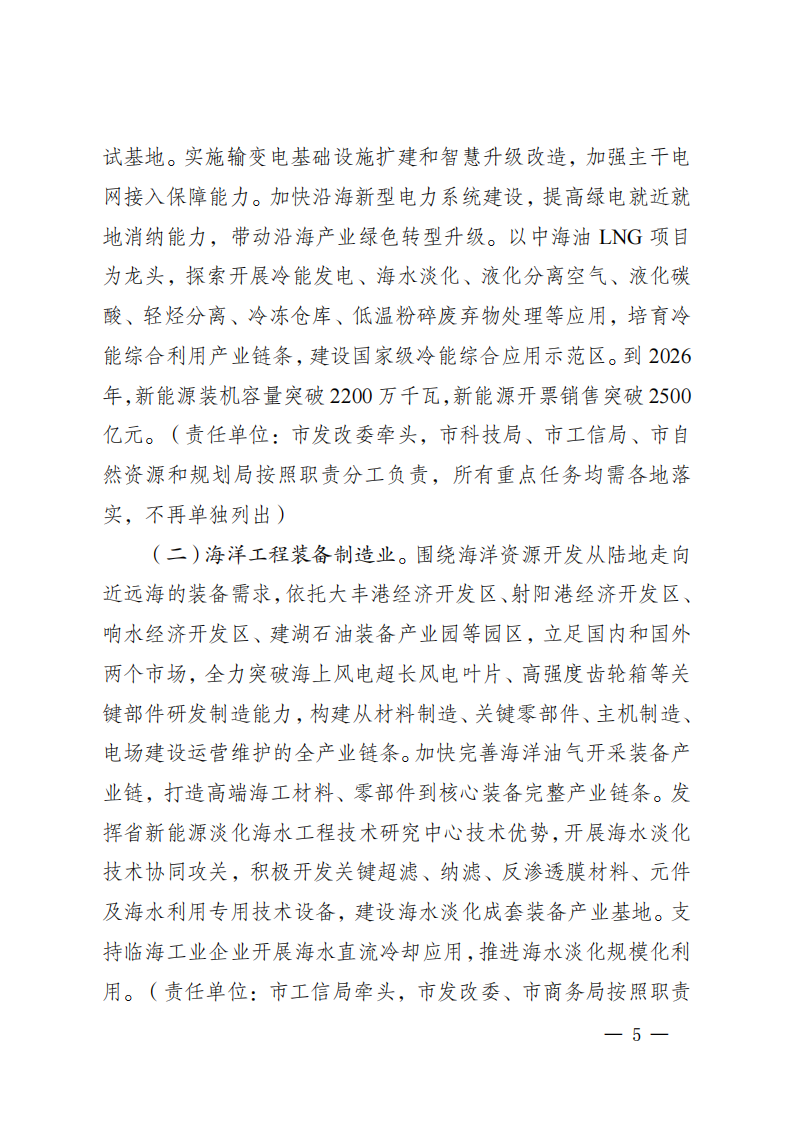 推进高效电池片、大尺寸组件、逆变器、储能系统等关键零部件研发制造,建设具有全球影响力的光伏装备智造集群和国家级光伏研发测—4—试基地。实施输变电基础设施扩建和恒盛娱乐升级改造,加强主干电网接入保障能力。加快沿海新型电力系统建设,提高绿电就近就地消纳能力,带动沿海产业绿色转型升级。以中海油LNG项目为龙头,探索开展冷能发电、海水淡化、液化分离空气、液化碳酸、轻烃分离、冷冻仓库、低温粉碎废弃物处理等应用,培育冷能综合利用产业链条,建设国家级冷能综合应用示范区。到2026年,新能源装机容量突破2200万千瓦,新能源开票销售突破2500亿元。
