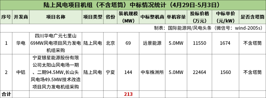 据国际能源网/风电头条(微信号:wind-2005s)统计,本周陆上风电不含塔筒项目共计2个,规模总计213MW,项目中标均价为1617元/kW。