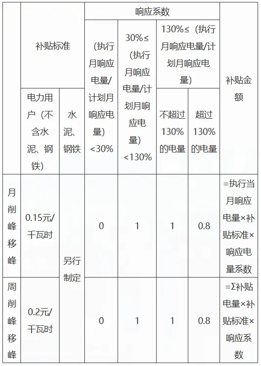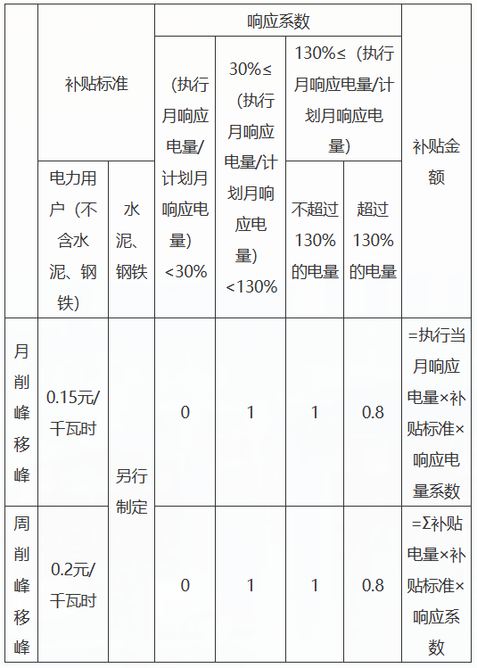 备注:需求响应单次补贴金额=响应功率×响应功率系数×补贴标准×响应时长系数。