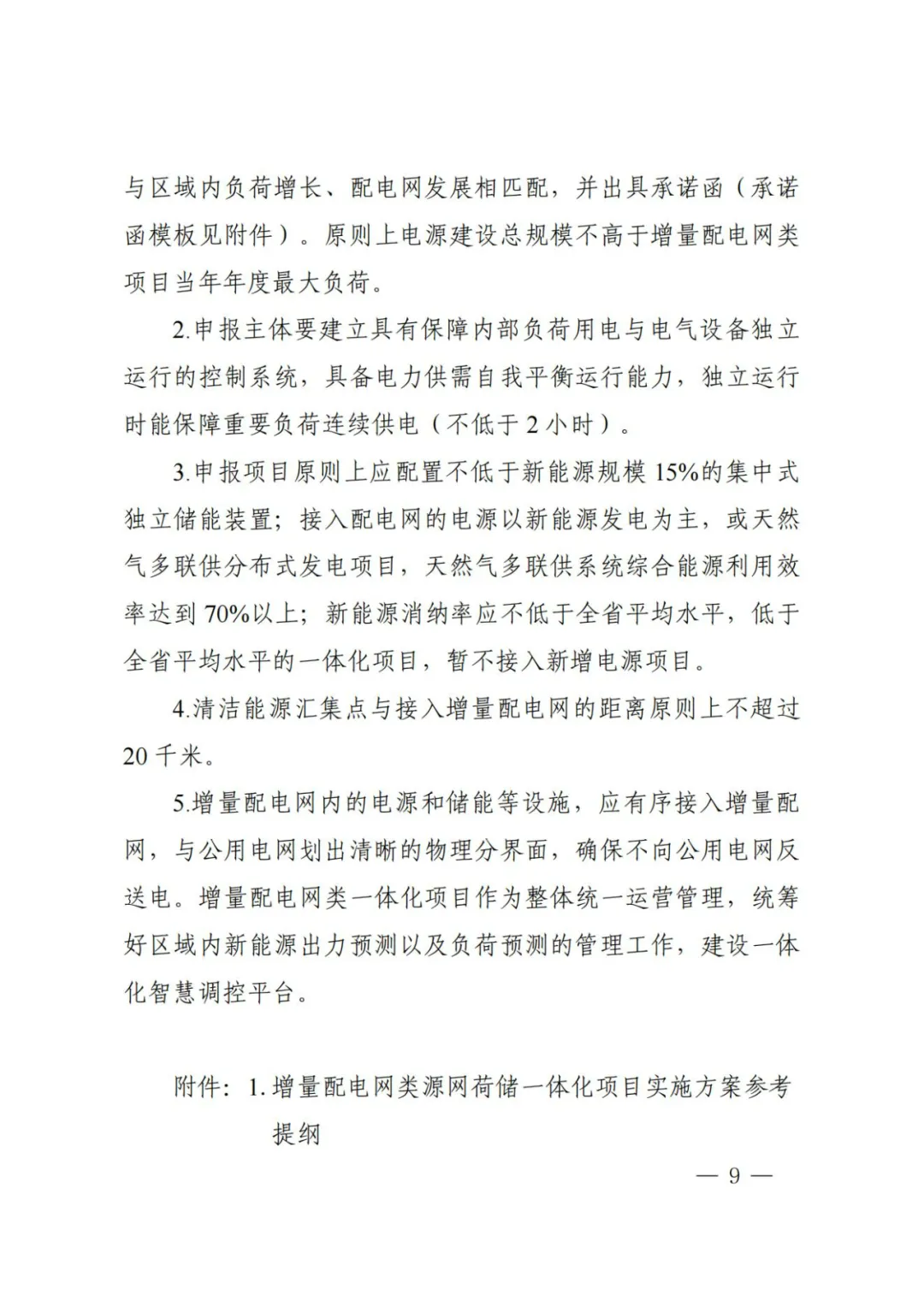 申报项目原则上应配置不低于新能源规模15%的集中式独立储能装置;接入配电网的电源以新能源发电为主,或天然气多联供分布式发电项目,天然气多联供系统综合能源利用效率达到70%以上;新能源消纳率应不低于全省平均水平,低于全省平均水平的一体化项目,暂不接入新增电源项目。
