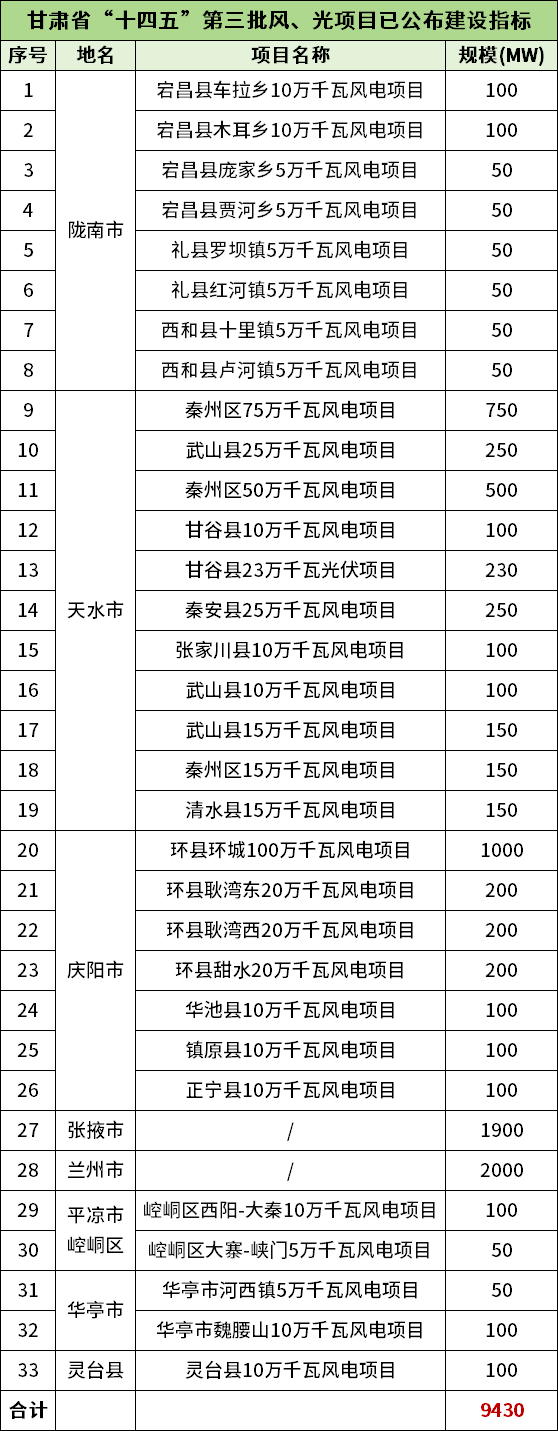 据国际能源网/风电头条(微信号:wind-2005s)了解,甘肃目前已有陇南、天水、庆阳、张掖、兰州、平凉市崆峒区、华亭市、灵台县8地下发“十四五”第三批新能源项目竞配方案,规模累计达9430MW。