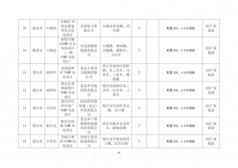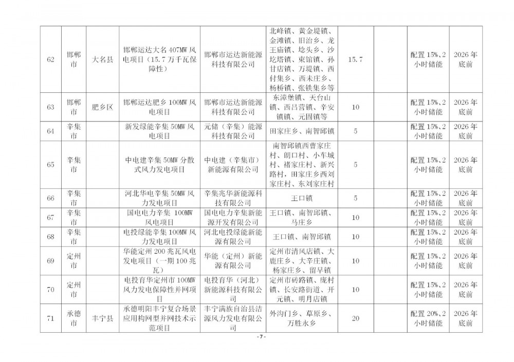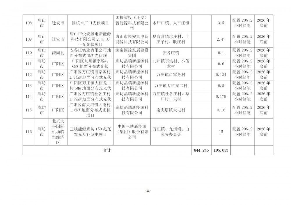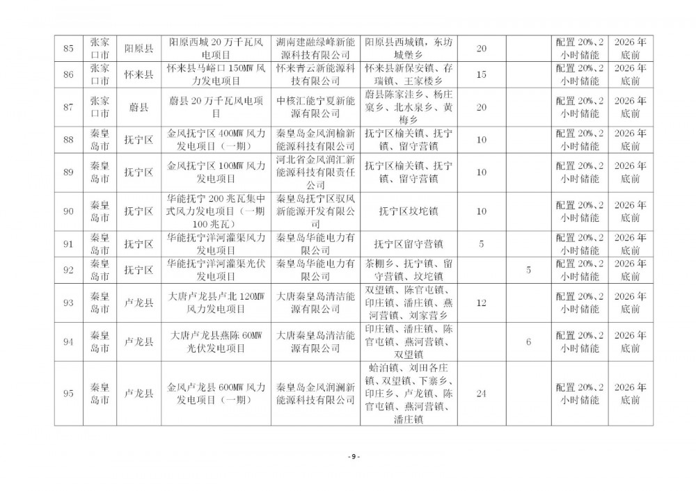 116个保障性项目中:包括风电项目85个,规模8.442GW;光伏项目31个,规模1.951GW。保定、沧州、定州、邯郸、衡水、石家庄、辛集、邢台8个市71个项目按照15%/2h配置储能,6.014GW项目配储902.11MW/1804.22MWh;承德、廊坊、秦皇岛、唐山、张家口5个市47个项目按照20%/2h配置储能,4.379GW项目配储875.79MW/1751.57MWh。