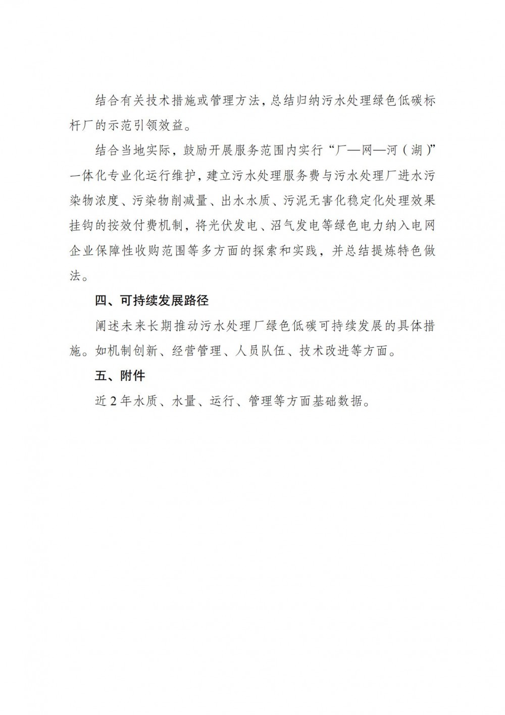 附件1《XX污水处理厂参评绿色低碳标杆厂申请报告》中提出,结合当地实际,鼓励开展服务范围内实行“厂—网—河(湖)”一体化专业化运行维护,建立污水处理服务费与污水处理厂进水污染物浓度、污染物削减量、出水水质、污泥无害化稳定化处理效果挂钩的按效付费机制,将光伏发电、沼气发电等绿色电力纳入电网企业保障性收购范围等多方面的探索和实践,并总结提炼特色做法。
