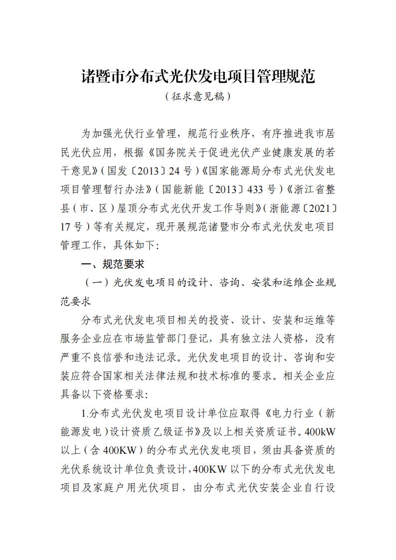 日前,诸暨市政府发布诸暨市分布式光伏发电项目管理规范(征求意见稿)。