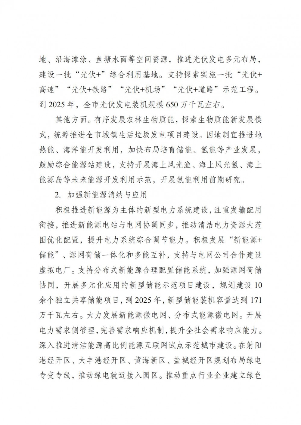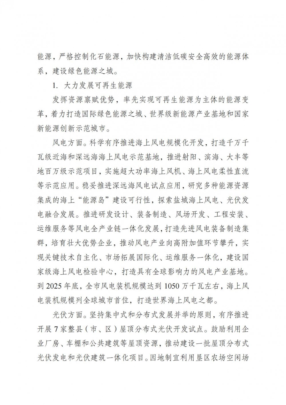 科学有序推进海上风电规模化开发,打造千万千瓦级近海和深远海海上风电示范基地,推进射阳、滨海、大丰等地百万级示范项目,实施超大功率海上风机、海上风电柔性直流等示范应用。稳妥推进深远海风电试点应用,研究多种能源资源集成的海上“能源岛”建设可行性,探索盐城海上风电、光伏发电融合发展。推进研发设计、装备制造、风场开发、工程安装、运维服务等风电全产业链一体化发展,打造先进风电装备制造集群,培育壮大优势企业,推动风电产业向高附加值环节攀升,实现关键技术自主化、市场拓展国际化、运维服务一体化,建设国家级海上风电检验中心,打造具有全球影响力的风电产业基地。到2025年底,全市风电装机规模达到1050万千瓦左右,海上风电装机规模列全球城市首位,打造世界海上风电之都。