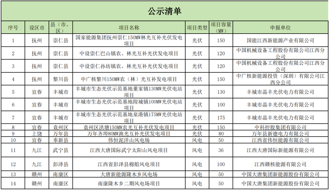文件指出,按照前期关于适时开展新能源发电项目市场化消纳和交易有关工作提示的要求,江西省能源局对各地上报的申请转为市场化交易的项目进行了审核,拟同意国家能源集团抚州崇仁150MW林光互补光伏发电项目等14个项目由保障性消纳项目转为市场化交易项目,项目规模总计1461MW。其中,风电项目5个,项目规模共计286MW;光伏项目9个,项目规模总计1175MW。