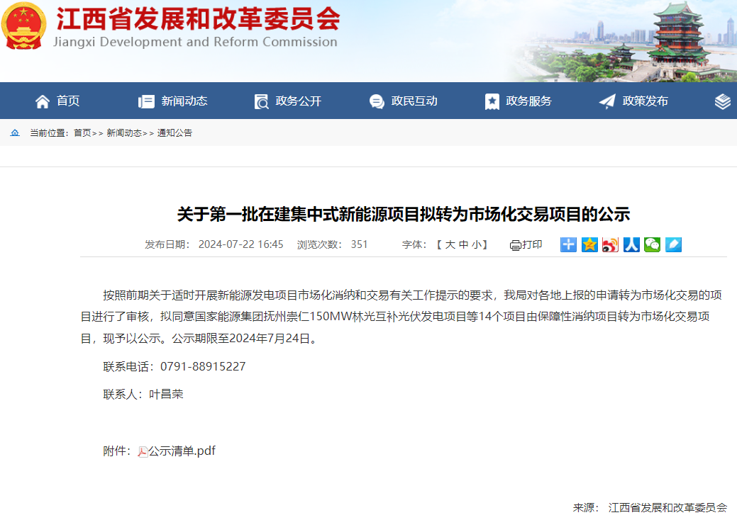 7月22日,江西省发展和改革委员会发布《关于第一批在建集中式新能源项目拟转为市场化交易项目的公示》。