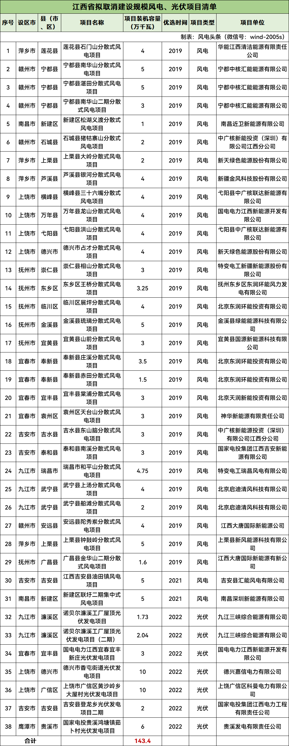 2月5日,江西省能源局发布关于拟取消建设规模风电、光伏项目的公示,江西省拟取消风电、光伏项目38个,规模总计1433.7MW,其中,风电项目31个,规模总计1086万千瓦;光伏项目7个,规模总计347.7MW。项目业主包括华能、中核、中广核、大唐、国家电投、三峡、特变电工、金风科技等。(详情查看:调整10.08GW、取消1.78GW!河北、江西风电、光伏发电项目情况公示!)