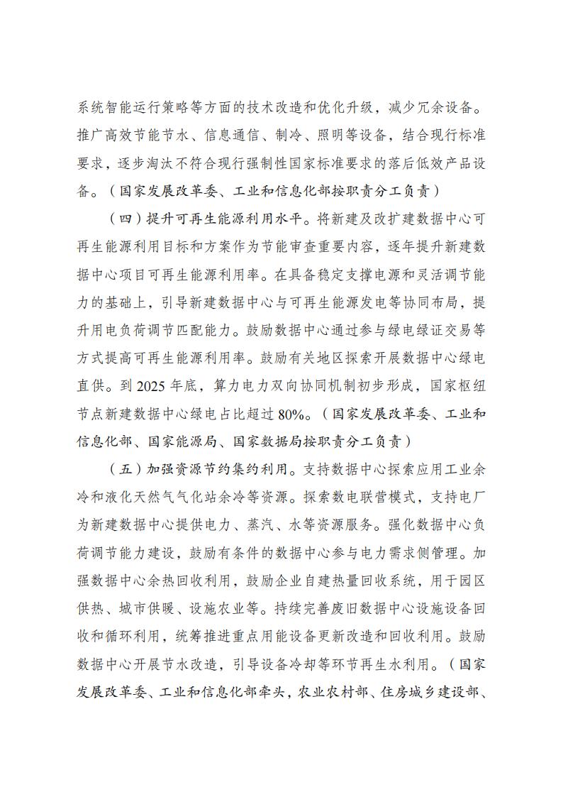 文件明确,提升可再生能源利用水平。将新建及改扩建数据中心可再生能源利用目标和方案作为节能审查重要内容,逐年提升新建数据中心项目可再生能源利用率。在具备稳定支撑电源和灵活调节能力的基础上,引导新建数据中心与可再生能源发电等协同布局,提升用电负荷调节匹配能力。鼓励数据中心通过参与绿电绿证交易等方式提高可再生能源利用率。鼓励有关地区探索开展数据中心绿电直供。到 2025 年底,算力电力双向协同机制初步形成,国家枢纽节点新建数据中心绿电占比超过 80%。