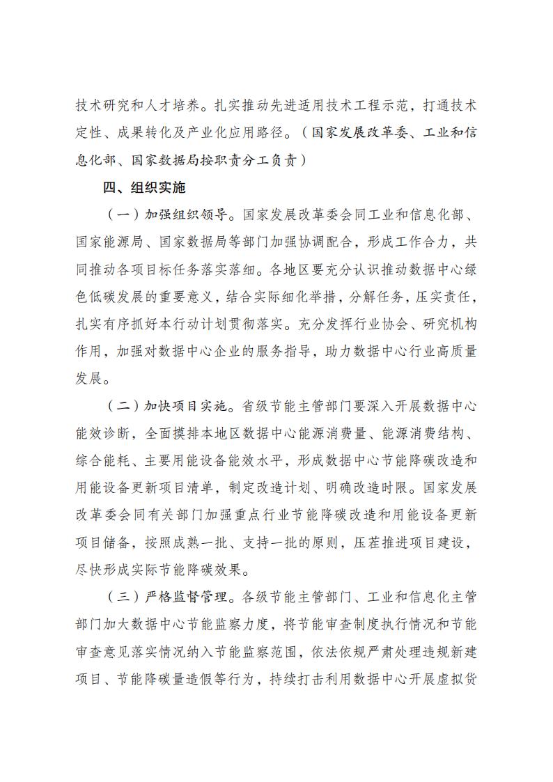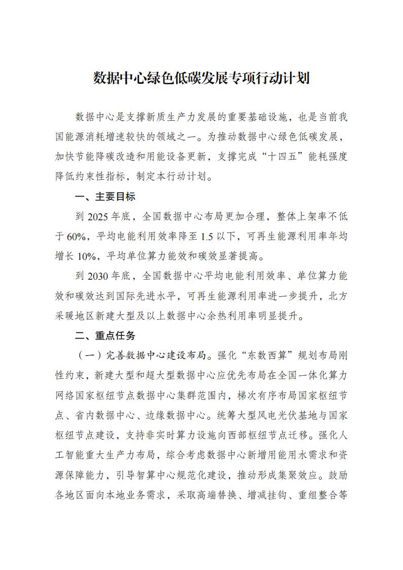 为全面贯彻党的二十大精神,认真落实党中央、国务院决策部署,实施全面节约战略,加大节能降碳工作力度,推动数据中心绿色低碳发展,加快节能降碳改造和用能设备更新,支撑完成“十四五”能耗强度降低约束性指标,国家发展改革委、工业和信息化部、国家能源局、国家数据局等部门制定了《数据中心绿色低碳发展专项行动计划》。现印发给你们,请认真抓好落实。
