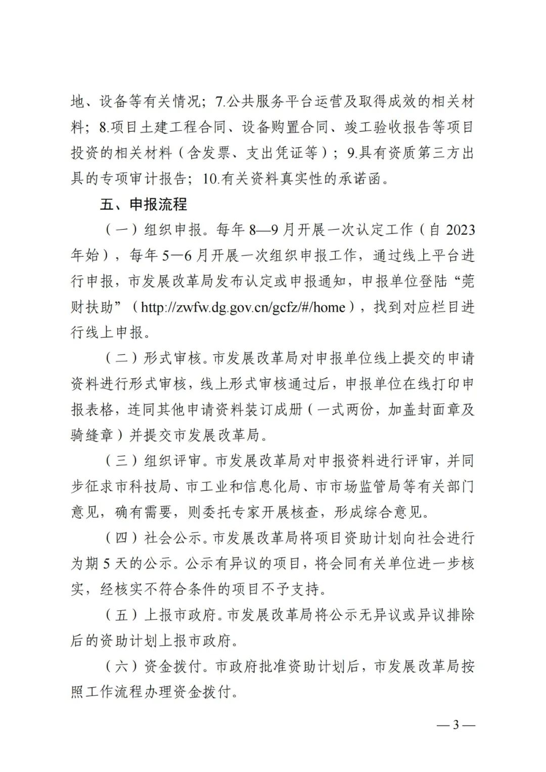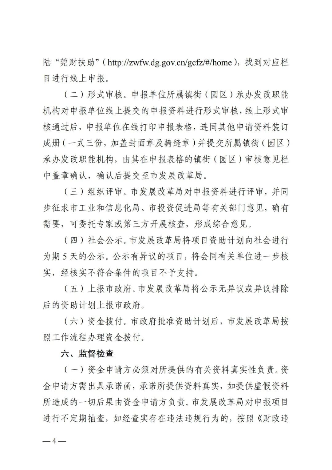 (四)公示。市发展改革局将项目资助计划向社会进行为期5天的公示(东莞市发展和改革局官网http://dgdp.dg.gov.cn)。公示如有异议的项目,将会同有关单位进一步核实,经核实不符合条件的项目不予支持。