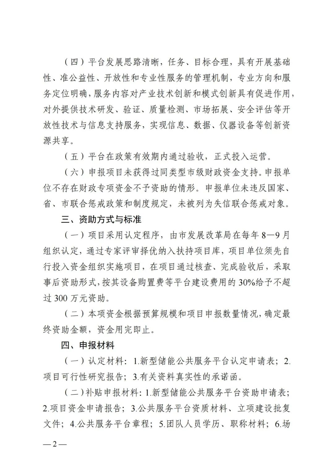(一)项目采取示范认定制度,由市发展改革局在每年8—9月组织认定,通过专家评审择优纳入示范项目库,项目单位须先自行投入资金组织实施项目。次年组织补贴申报时,对获得认定、通过核查、完成验收的示范项目,自投运次月起,按经核定的实际放电量,给予投资主体不超过0.3元/千瓦时的事后资助,补贴累计不超过2年,单个项目累计补贴不超过300万元。