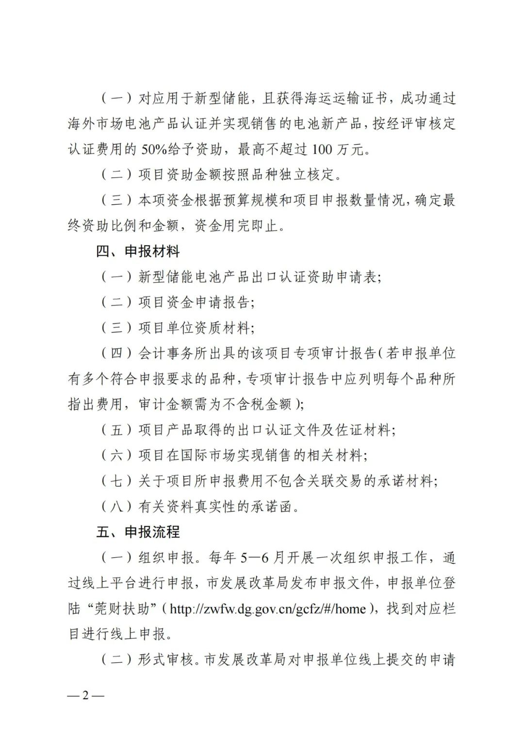 (一)对应用于新型储能,且获得海运运输证书,成功通过海外市场电池产品认证并实现销售的电池新产品,按经评审核定认证费用的 50%给予资助,最高不超过100 万元。