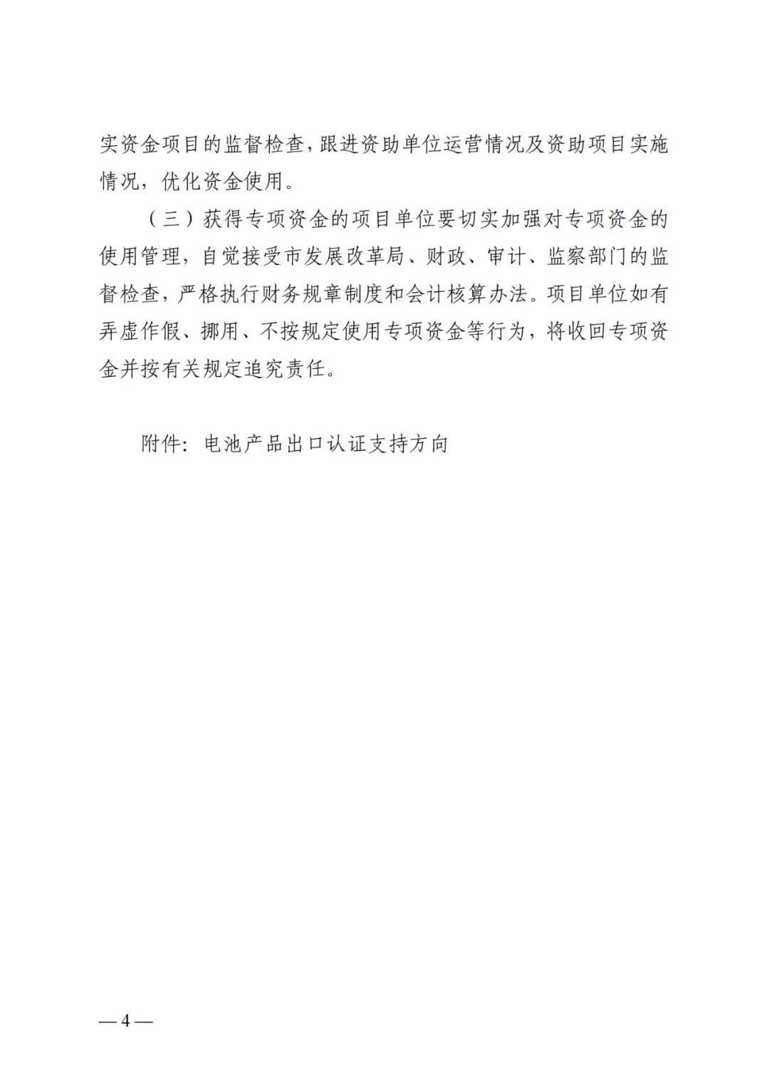 文件明确资金的支持范围主要包括:增资扩产贷款贴息资助、创新载体建设奖励、电池产品出口认证资助、示范应用资助、公共服务平台资助5个方面。