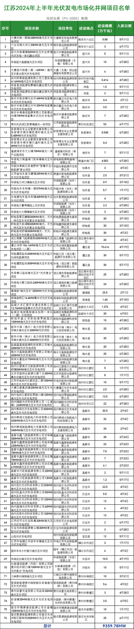 7月30日,江苏省发改委发布发布2024年上半年光伏发电市场化并网项目名单。根据名单显示,此次公布的项目共计76个,合计容量9359.78MW。