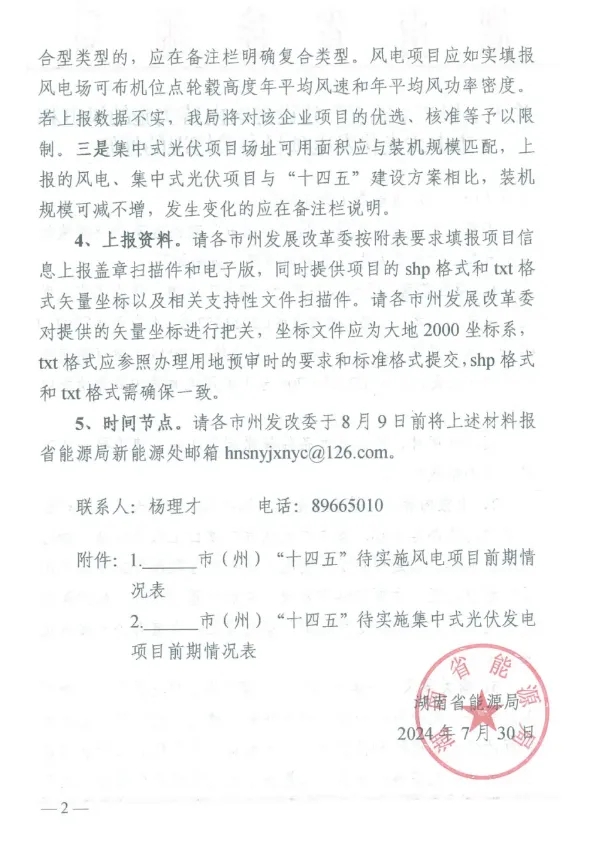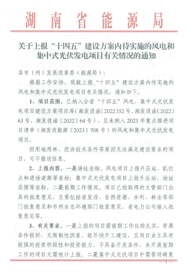 7月30日,湖南省能源局下发《关于上报“十四五”建设方案内待实施的风电和集中式光伏发电项目有关情况的通知》。