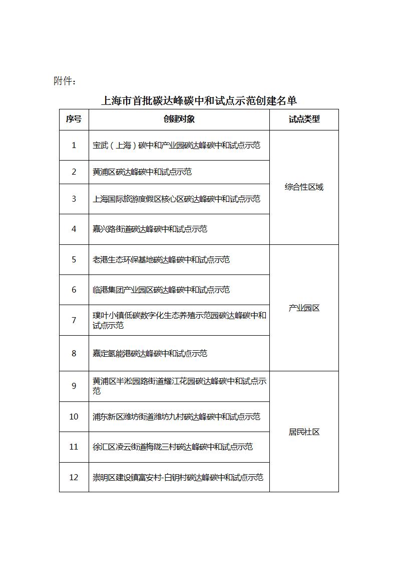 附件:上海市首批碳达峰碳中和试点示范创建名单