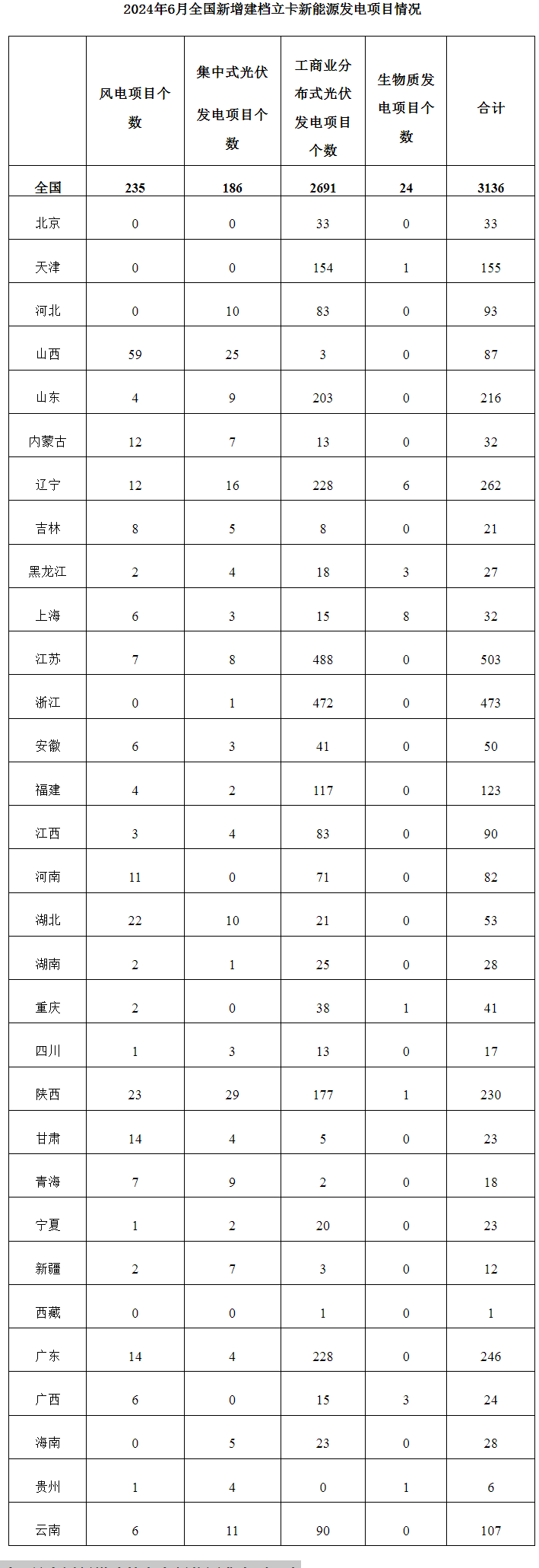 2024年6月,全国新增建档立卡新能源发电(不含户用光伏)项目共3136个,其中风电项目235个,光伏发电项目2877个(集中式光伏发电项目186个,工商业分布式光伏发电项目2691个),生物质发电项目24个。