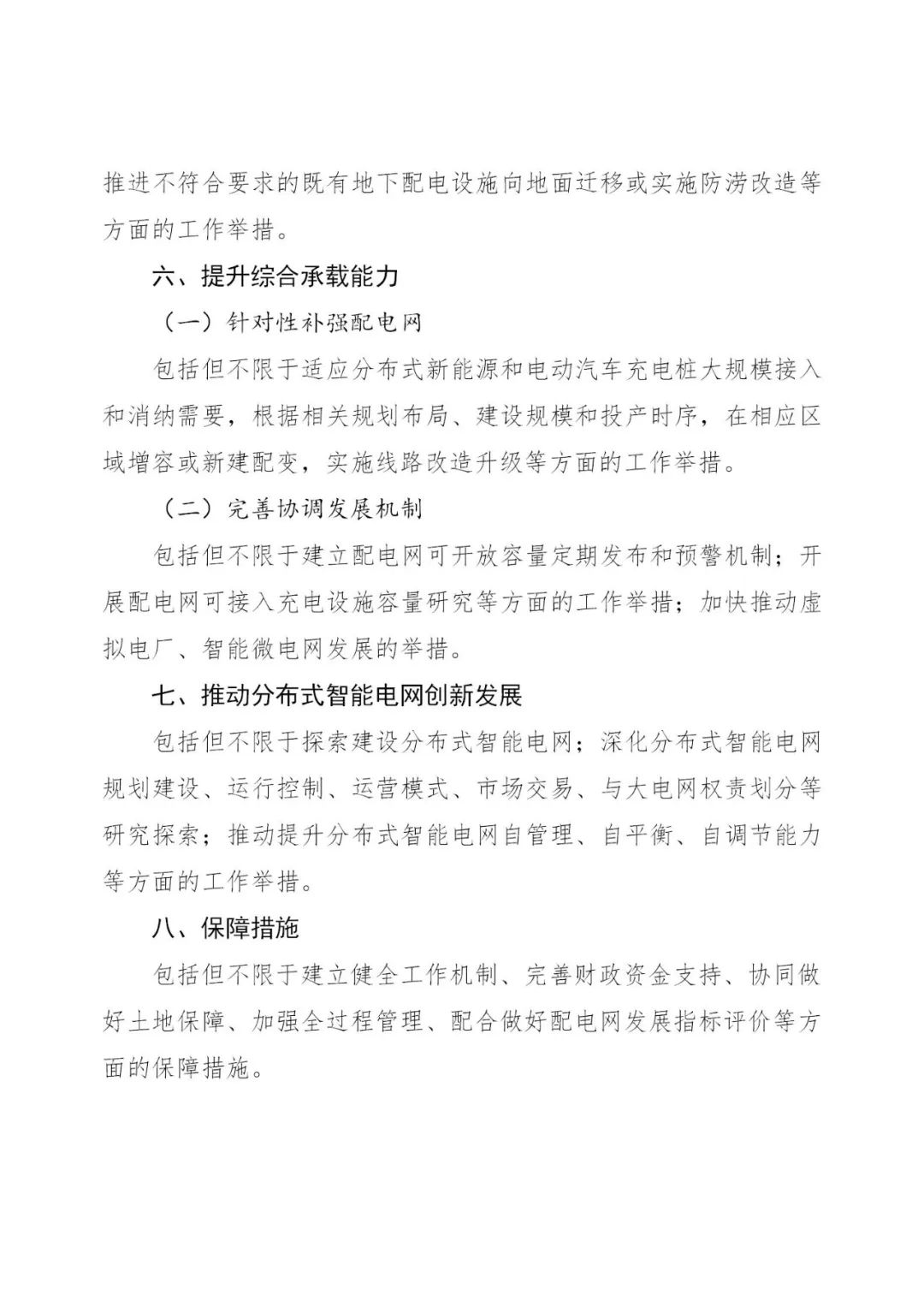 完善配电网与分布式新能源协调发展机制。结合最新情况研究并规范配电网可承载分布式光伏规模计算方法。在现有6个试点省份的基础上,各省(区、市)能源主管部门系统组织开展新能源接网影响分析,评估配电网承载力,建立配电网可开放容量定期发布和预警机制,按季度向社会公布县(市)一级电网不同区域可承载规模信息,引导分布式新能源科学布局、有序开发、就近接入、就地消纳,并分析提出进一步提升可承载规模的方案、举措和时限要求。