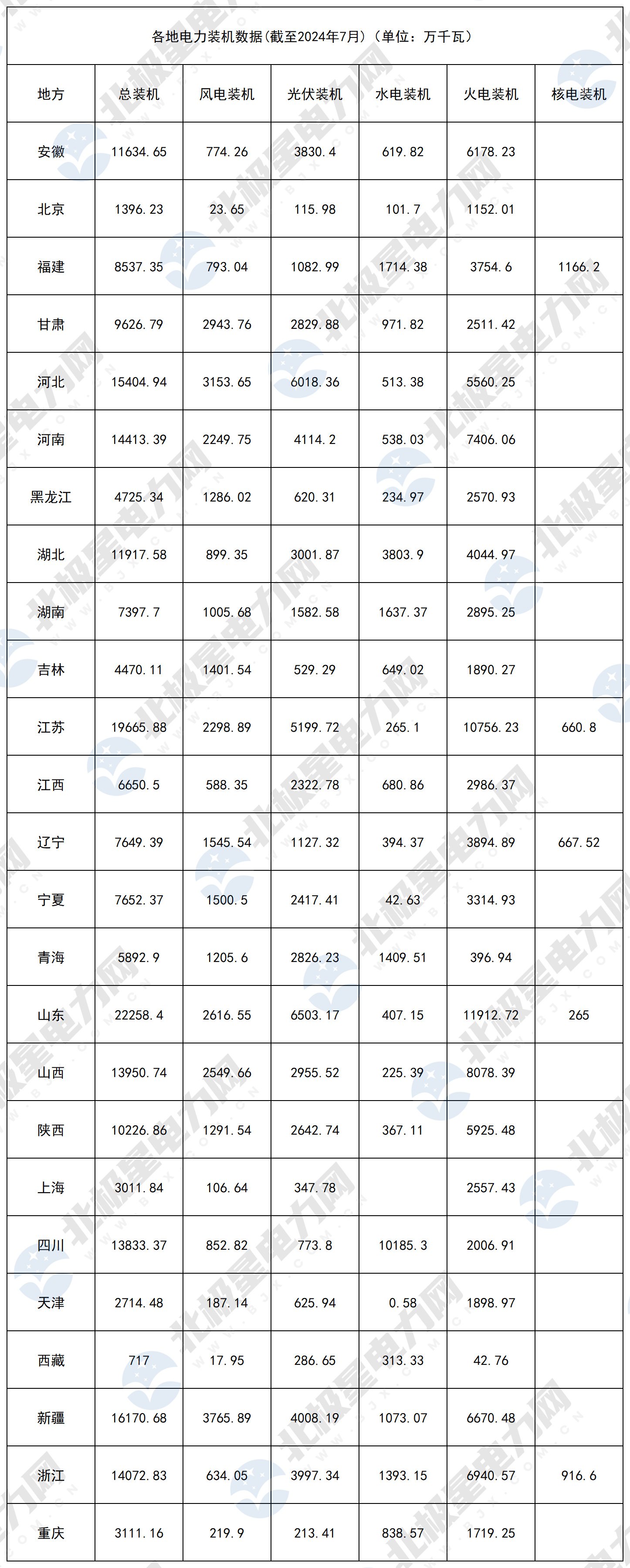 根据相关数据整理了25个省份电力装机数据(截至2024年7月),包括电力总装机、火电装机、水电装机、风电装机、光伏装机、核电装机,整理如下: