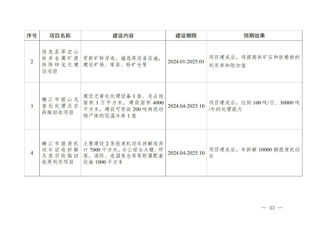 结合全市固废种类和再生资源产业结构,重点推动建筑垃圾再生产制备混凝土、铁多金属矿提铁降锌优化建设、开采金属矿石采出废石综合利用、农药瓶回收、报废机动车回收拆解及废旧轮胎回收再利用等资源综合利用重点工程建设,提升资源综合利用率。