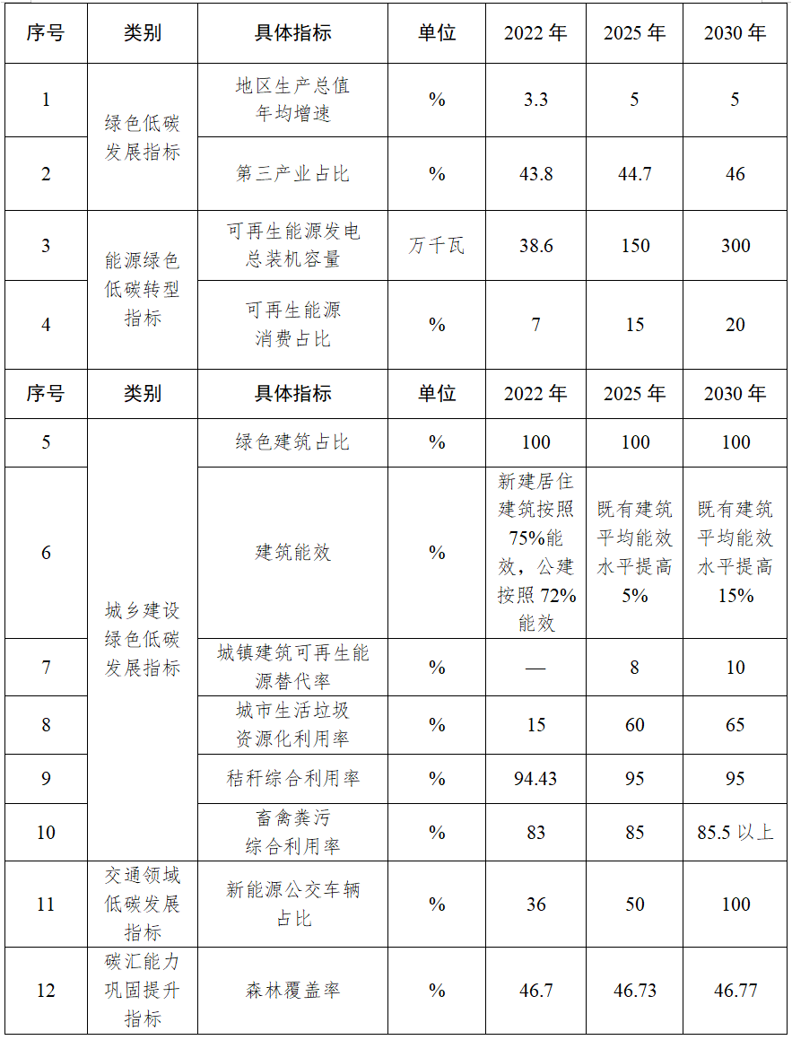 到2025年,产业结构和能源结构调整优化取得明显成效,能源资源利用效率持续提高,绿色低碳技术研发和推广应用取得新进展,绿色生产生活方式得到普遍推行,绿色低碳循环发展政策体系初步建立。可再生能源发电总装机容量达到150万千瓦,公共交通新能源公交车辆占比达到50%,森林覆盖率达到46.73%,单位地区生产总值能源消耗和二氧化碳排放下降,确保完成省下达目标任务。到2030年,产业结构调整取得重大进展,重点领域低碳发展模式基本形成,清洁低碳、安全高效的能源体系初步建立,非化石能源消费比重进一步提高,绿色生活方式成为公众自觉选择,绿色低碳循环发展政策体系基本健全,绿色低碳发展水平明显提升。可再生能源消费占比达到20%,单位地区生产总值能源消耗和二氧化碳排放下降,确保完成省下达目标任务,按期实现碳达峰目标。