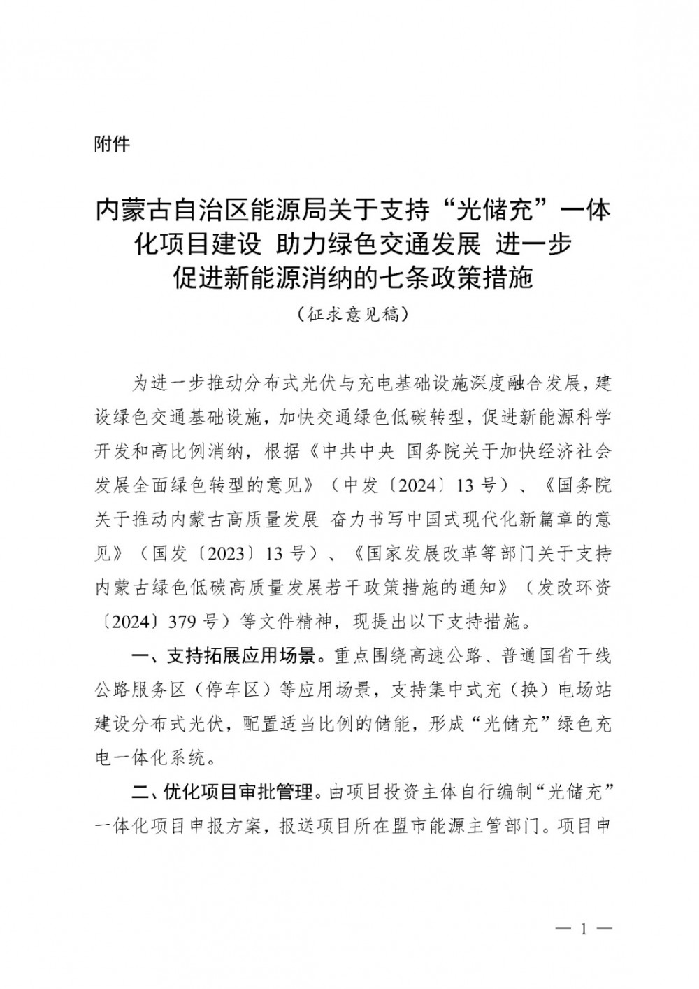 附件:内蒙古自治区关于支持“光储充”一体化项目建设 助力绿色交通发展 进一步促进新能源消纳的七条政策措施(征求意见稿)