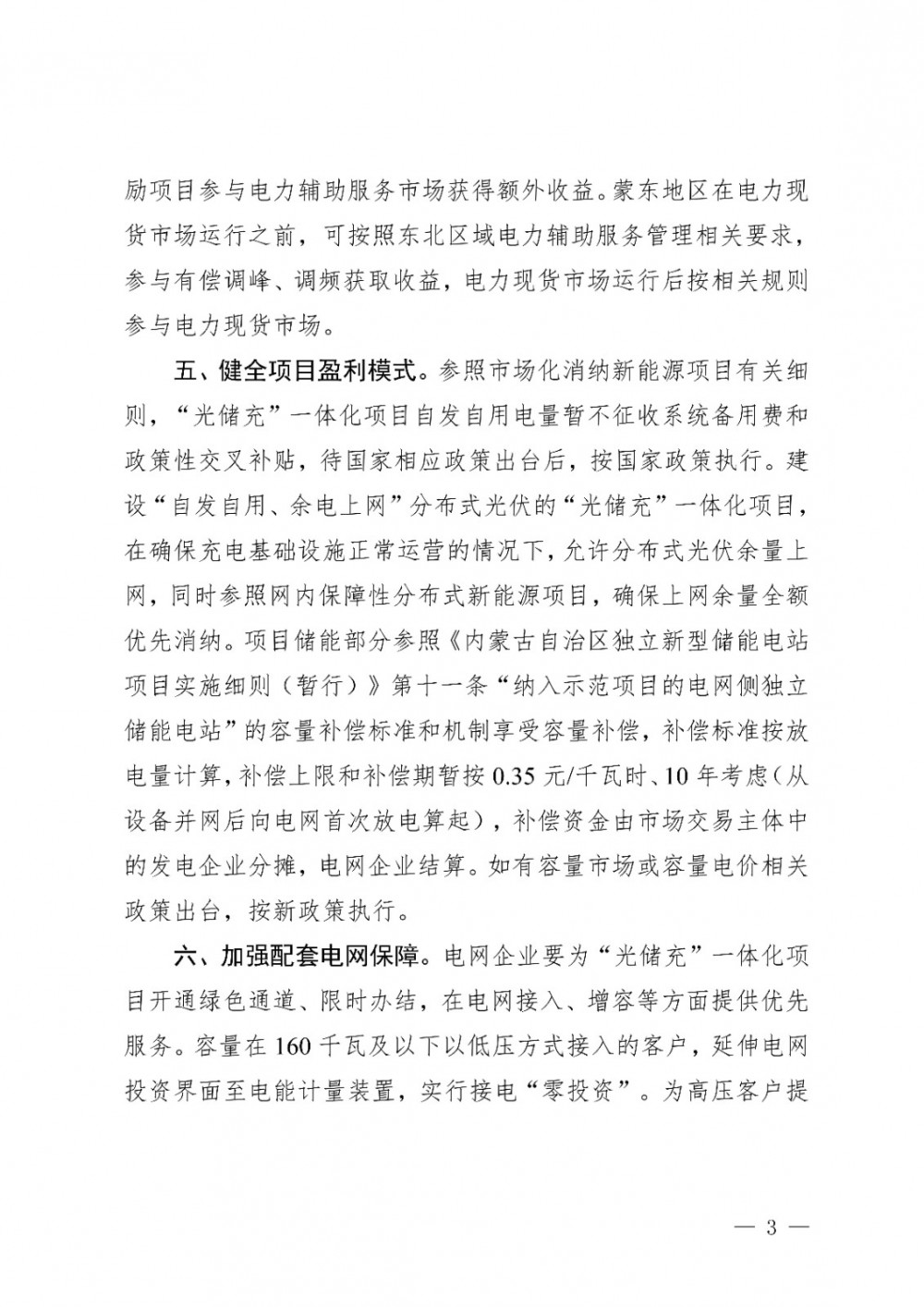 文件明确,健全项目盈利模式。参照市场化消纳新能源项目有关细则,“光储充”一体化项目自发自用电量暂不征收系统备用费和政策性交叉补贴,待国家相应政策出台后,按国家政策执行。建设“自发自用、余电上网”分布式光伏的“光储充”一体化项目,在确保充电基础设施正常运营的情况下,允许分布式光伏余量上网,同时参照网内保障性分布式新能源项目,确保上网余量全额优先消纳。项目储能部分参照《内蒙古自治区独立新型储能电站项目实施细则(暂行)》第十一条“纳入示范项目的电网侧独立储能电站”的容量补偿标准和机制享受容量补偿,补偿标准按放电量计算,补偿上限和补偿期暂按0.35元/千瓦时、10年考虑(从设备并网后向电网首次放电算起),补偿资金由市场交易主体中的发电企业分摊,电网企业结算。如有容量市场或容量电价相关政策出台,按新政策执行。