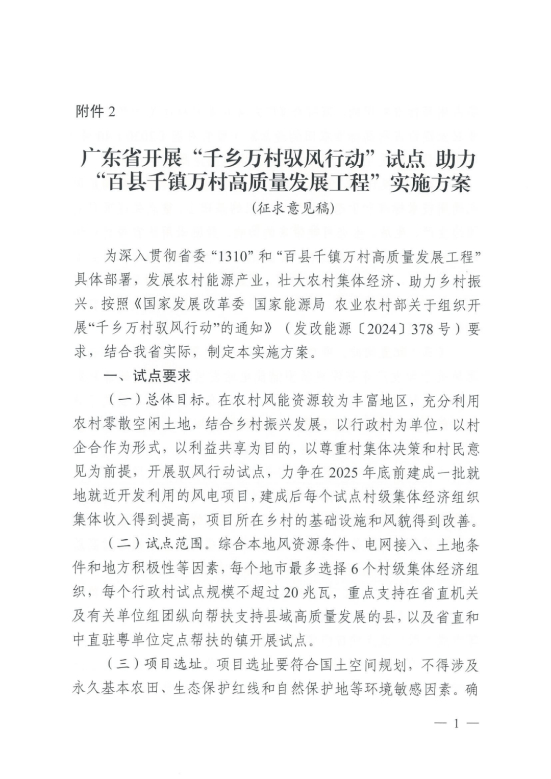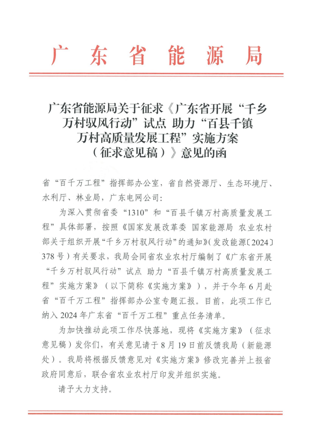 近日,广东省能源局关于征求《广东省开展“千乡万村驭风行动”试点 助力“百县千镇万村高质量发展工程”实施方案(征求意见稿)》意见的函。