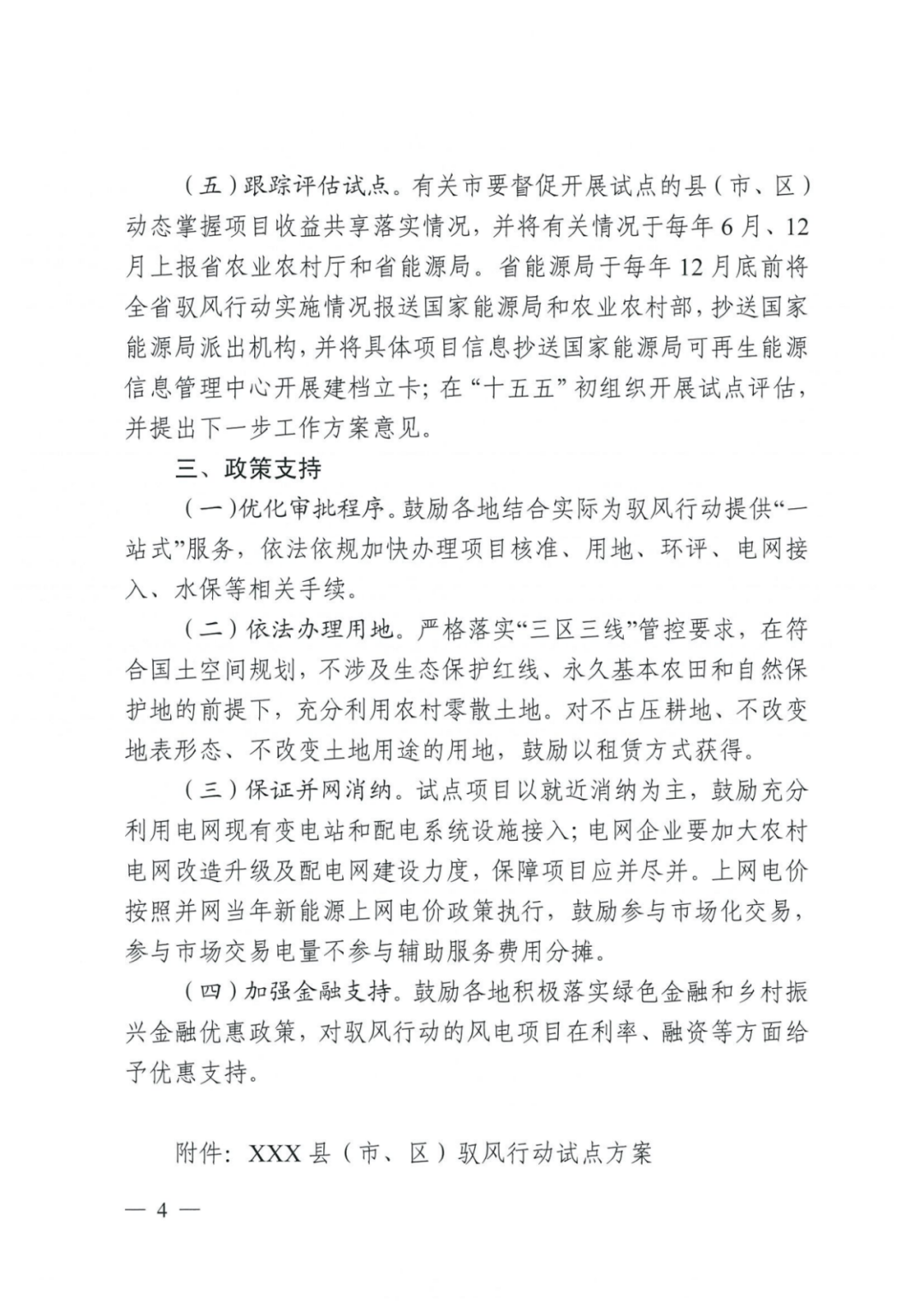 此外,其附件《XX县(市、区)驭风行动试点方案》显示,试点项目的基本情况,包括项目建设地点、装机容量:建设条件落实情况等;敏感性因素初步排查、项目布局及建设时序、风电机组选型初步方案及机位点布置、消纳和接入系统方案预计施工方案及工期安排、初步测算的经济效益分析、收益分配机制、乡村振兴实施效果;项目布局要合理,每个行政村试点总规模不超过20MW、每个市试点总规模不超过120MW。