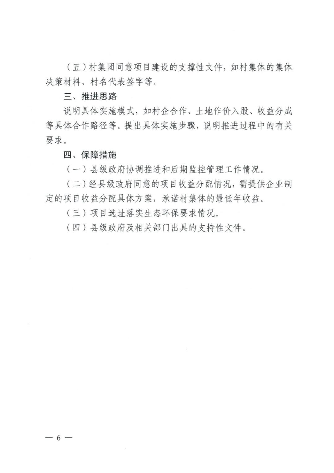 实施模式方面,试点项目应采取“村企合作”模式,村集体可依法依规利用乡村振兴专项资金、土地使用权作价、农户集资等方式入股;试点项目应实行“利益共享”,项目建成运行后村集体增收每兆瓦每年不得低于2万元(具体增收金额根据各村试点规模计);鼓励投资主体积极履行社会责任,统筹农村能源开发与农村基础设施条件改善,积极融入乡村振兴发展。