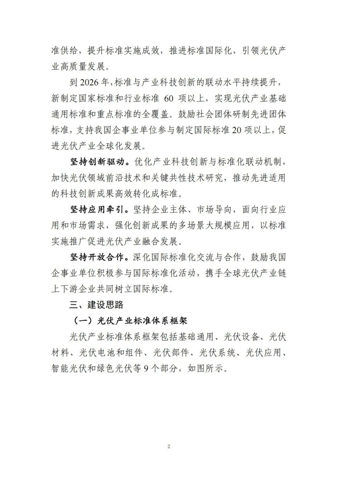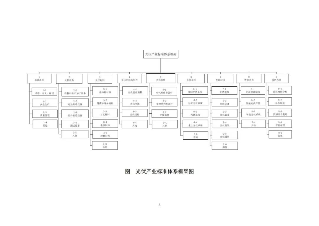 光伏产业标准体系框架包括基础通用、光伏设备、光伏材料、光伏电池和组件、光伏部件、光伏系统、光伏应用、智能光伏和绿色光伏等9个部分。