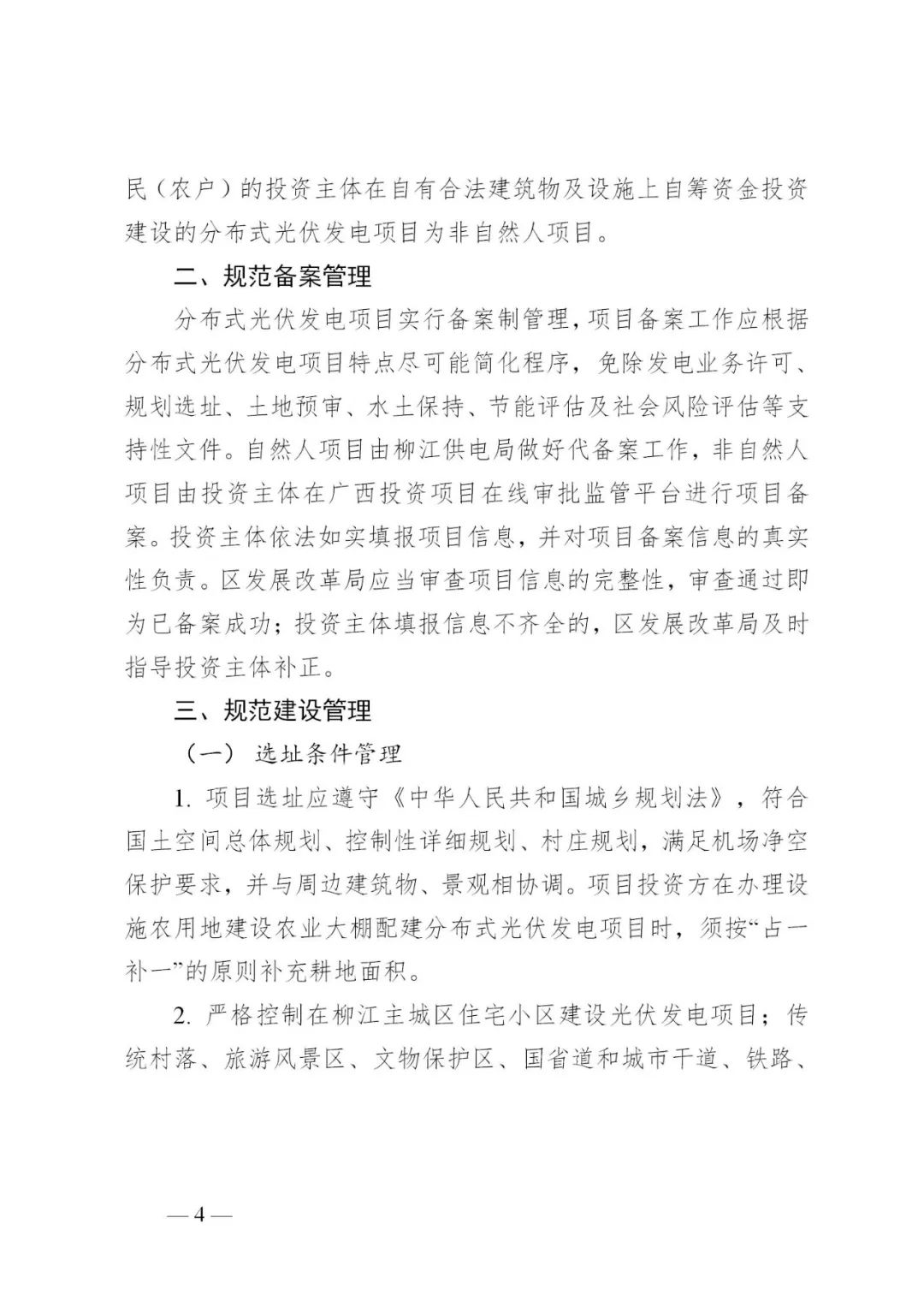 严格控制在柳江主城区住宅小区建设光伏发电项目;传统村落、旅游风景区、文物保护区、国省道和城市干道、铁路、高速公路、飞机场等范围内建设光伏发电项目,具体控制范围由有关行业主管部门依法划定。