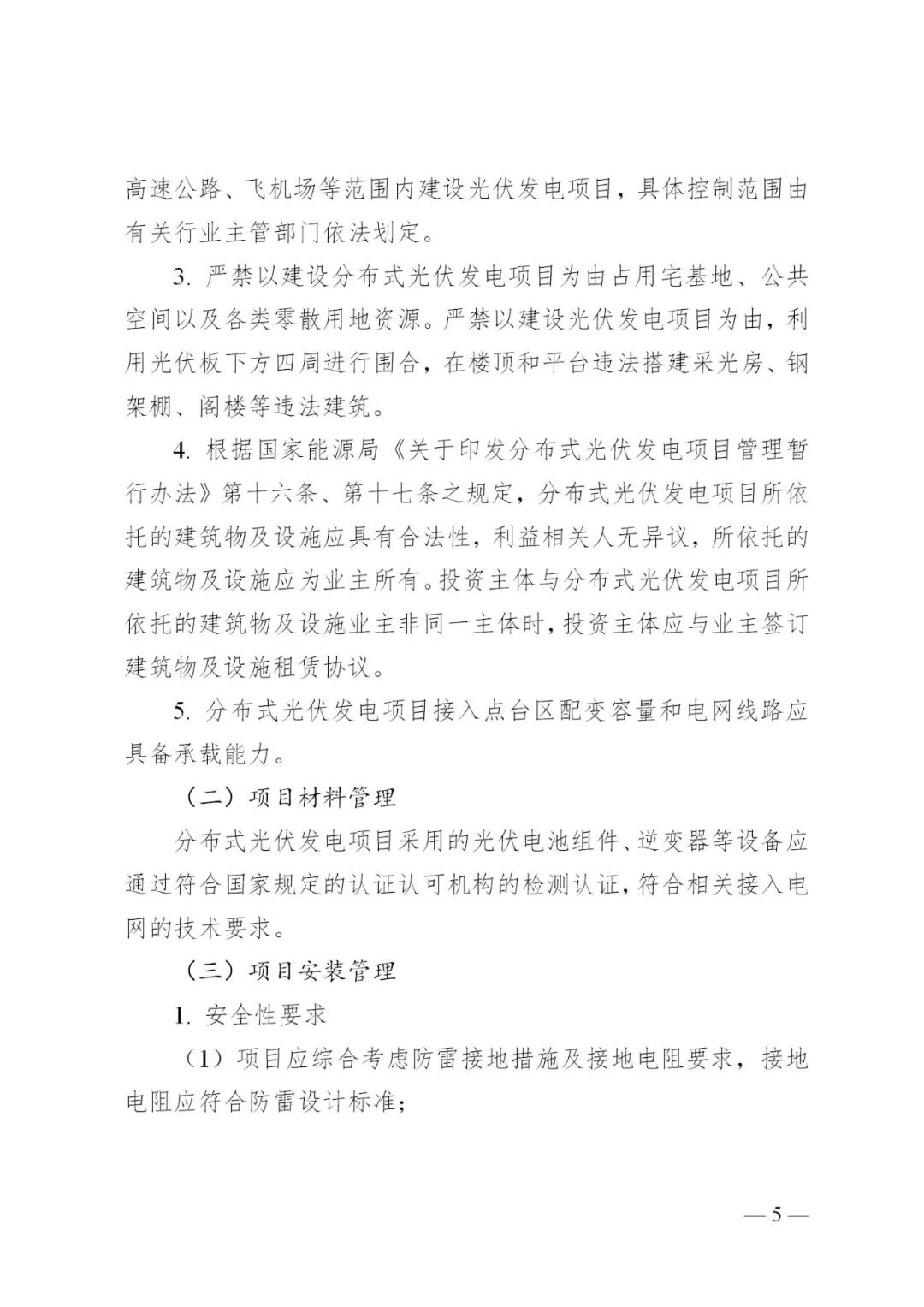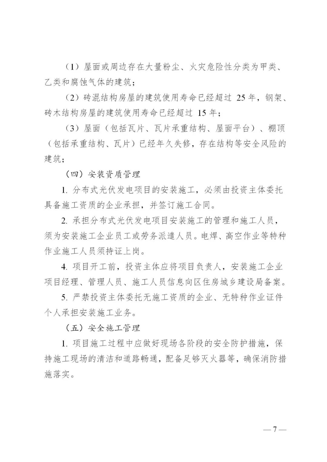 户用屋顶分布式光伏发电项目,当屋顶为平屋顶结构无突出楼梯间时,光伏板顶端不得超过屋面最高点 2.2米(含 2.2米);当屋顶为平屋顶结构有突出楼梯间时,光伏板顶端不得超过楼梯间屋面最高点 1米(含 1米,且最高点应不高于顶层屋面 4米);光伏板下方四周不得进行任何形式的围合,不得违反城乡规划管理的相关法律法规。