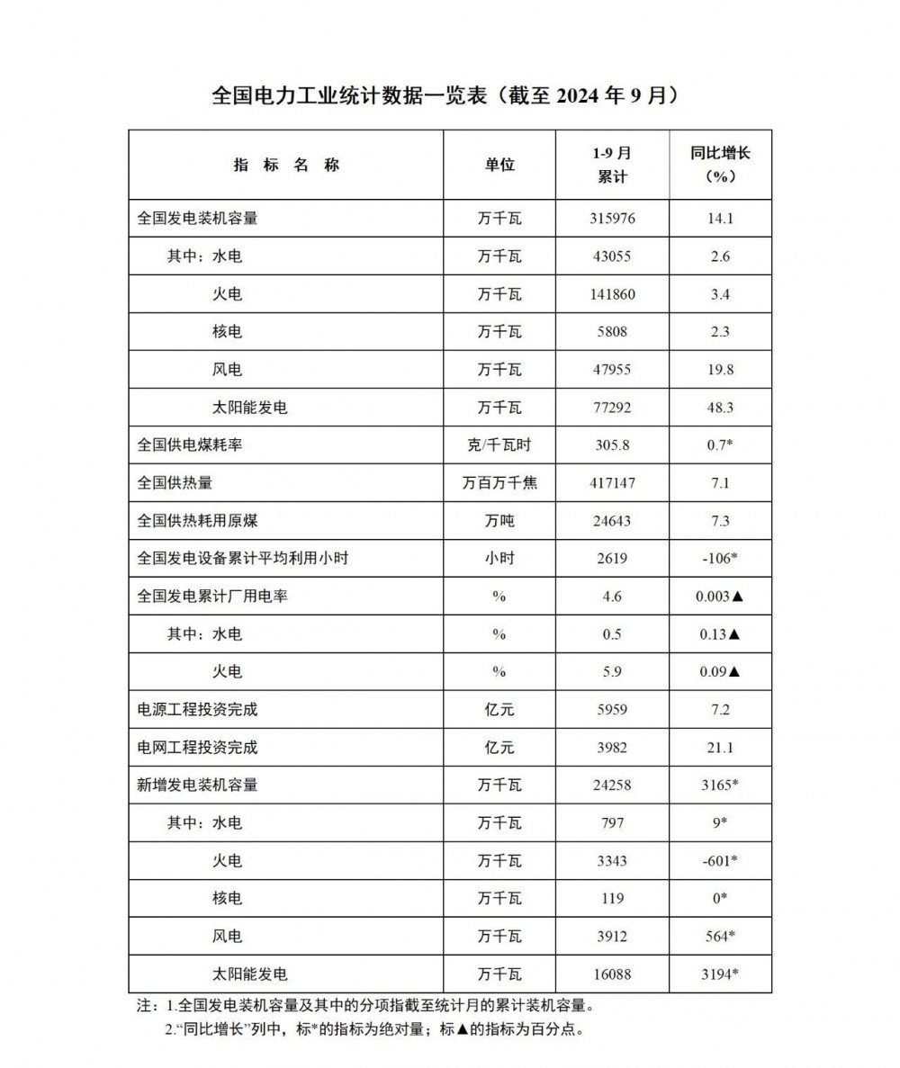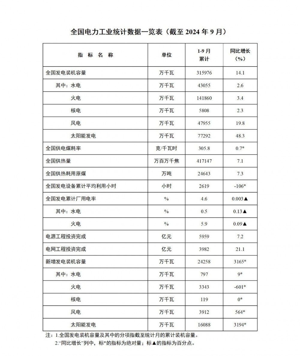 国家能源局发布2024年1-9月份全国电力工业统计数据