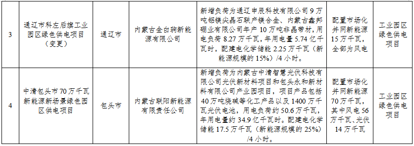 (三)通辽市科左后旗工业园区绿色供电项目。本项目为变更项目,新增负荷为通辽申辰科技有限公司9万吨铝镁尖晶石联产镁合金、内蒙古鑫邦硼业有限公司年产10万吨非晶带材,用电负荷8.27万千瓦,年用电量5.74亿千瓦时。配置市场化并网新能源15万千瓦,全部为风电,配建电化学储能2.25万千瓦(新能源规模的15%)/4小时。