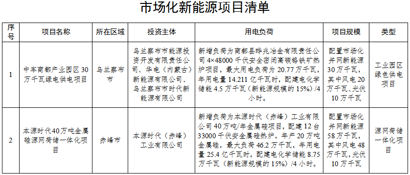 (一)中节能风力发电股份有限公司察右前旗兴和县50万千瓦工业园区绿色供电项目。新增负荷为腾飞铁合金公司6台全封闭电炉、蒙发铁合金公司1台全密闭矿热炉和1台半封闭矿热炉,年生产铁合金约64.7万吨,用电负荷约32.7万千瓦,年用电量约23.9亿千瓦时。配置市场化并网新能源50万千瓦,全部为风电,配建电化学储能7.5万千瓦(新能源规模的15%)/4小时。