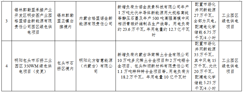 按照《内蒙古自治区工业园区绿色供电项目实施细则2023年版(试行)》、《内蒙古自治区源网荷储一体化项目实施细则2023年版(试行)》有关要求,经研究,自治区能源局同意实施乌兰察布中金数据低碳算力基地源网荷储一体化项目、锡林郭勒盟承接产业开发区明安图产业园绿色供电项目、锡林郭勒盟承接产业开发区明安图产业园格盟诺金新能源有限责任公司园区绿色供电项目、明阳包头市石拐工业园区350MW绿色供电项目,总计新能源规模102万千瓦,现将有关要求通知如下。