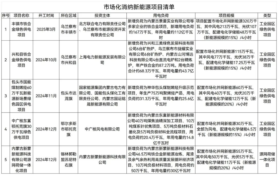 按照《内蒙古自治区工业园区绿色供电项目实施细则2023年版(试行)》《内蒙古自治区源网荷储一体化项目实施细则2023年版(试行)》有关要求,经研究,自治区能源局同意实施乌兰察布丰镇市铁合金绿色供电项目、兴和县铁合金绿色供电项目、包头市国能煤制烯烃60万千瓦新能源新场景绿色园区供电项目、鄂尔多斯市中广核东富鄂托克旗30万千瓦绿色供电项目、内蒙古新蒙新能源科技有限公司源网荷储一体化项目,配建新能源总规模580万千瓦,现将有关要求通知如下。