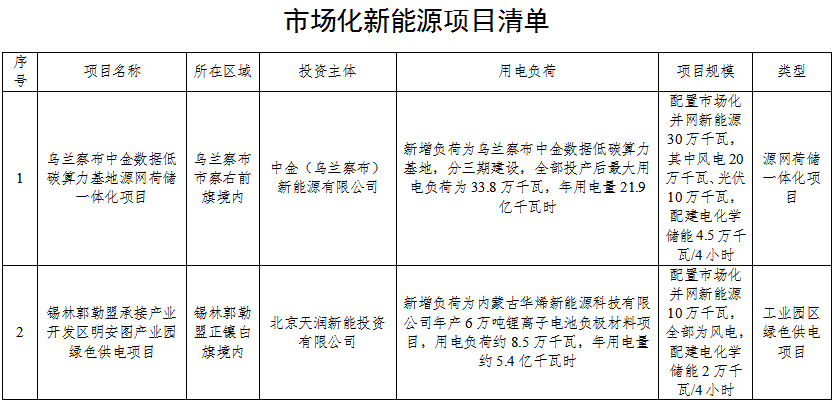 内蒙古自治区能源局关于实施乌兰察布中金数据低碳算力基地源网荷储一体化项目等4个市场化新能源项目的通知