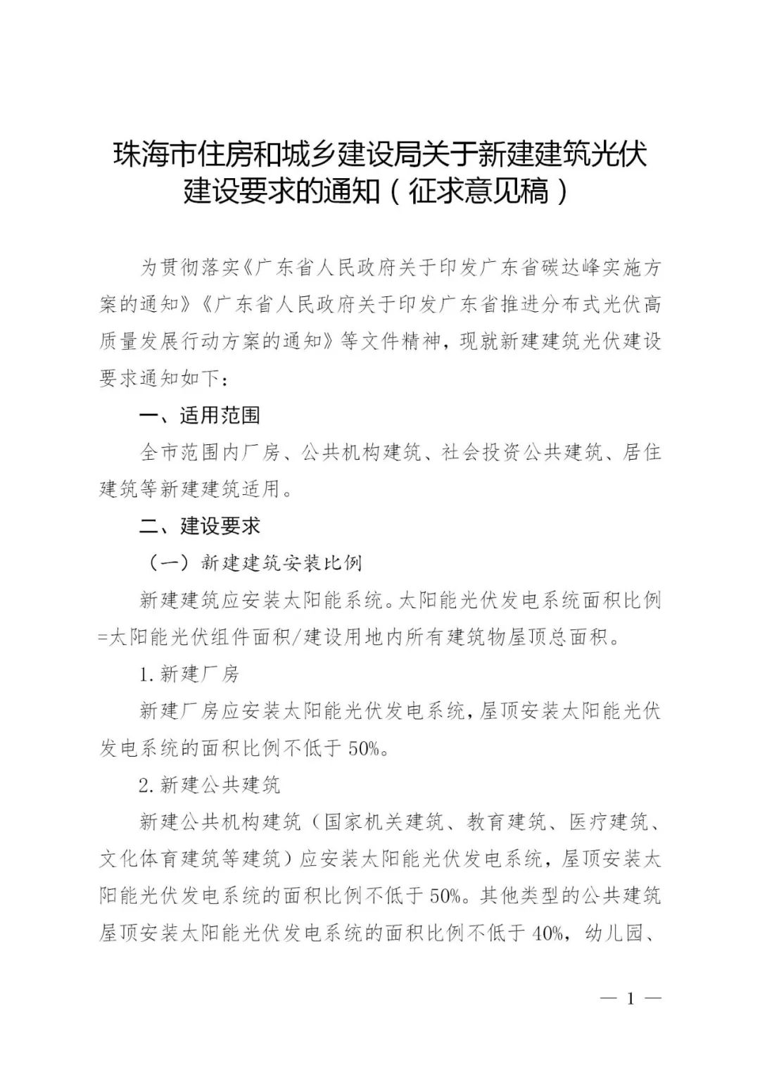 关于公开征求《珠海市住房和城乡建设局关于新建建筑光伏建设要求的通知 (征求意见稿)》意见的通知
