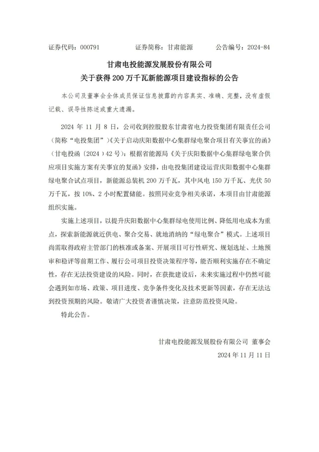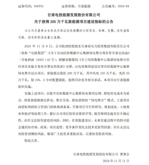 11月11日,甘肃电投能源发展股份有限公司发布关于获得200万千瓦新能源项目建设指标的公告。