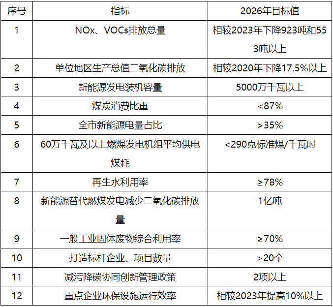 2026年,减污降碳协同能力显著提升,建立以重点企业信息台账为基础的污染物和碳排放协同管理机制,重点领域形成减污降碳协同技术清单和一批典型案例,减污降碳协同度有效提升,充分体现减污降碳协同创新对绿色低碳转型发展的促进作用。打造10个以上减污降碳协同增效标杆企业或标杆项目,新能源发电装机容量达到5000万千瓦以上,重点企业环保设施运行效率相较2023年提高10%以上,当年全市NOx、VOCs排放总量分别下降423吨、253吨以上,单位地区生产总值二氧化碳排放相较2020年下降17.5%以上。