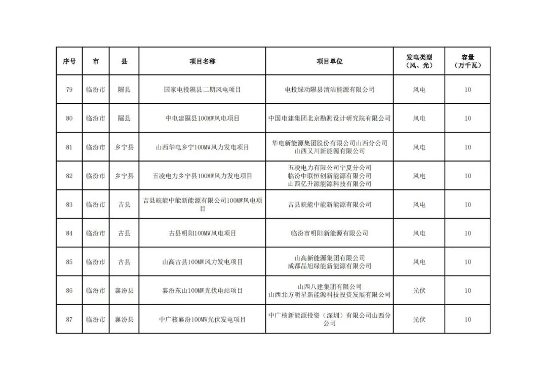 根据《山西省2024年风电、光伏发电开发建设竞争性配置工作方案》,经各市初选上报,省能源局组织了2024年竞争性配置风电、光伏发电项目评审,优选出保障性并网项目100个、规模1047万千瓦,现将结果予以公示。公示时间为2024年11月27至12月4日。如有异议,请在公示期内向项目所在市能源局提出书面意见,各市汇总上报省能源局。