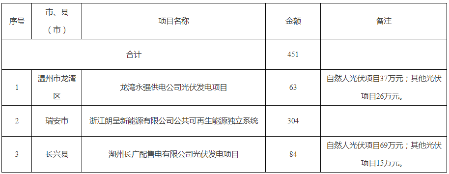 根据公示文件,本次下达金额合计451万元,其中龙湾永强供电公司光伏发电项目63万元,浙江朗呈新能源有限公司公共可再生能源独立系统304万元,湖州长广配售电有限公司光伏发电项目84万元。