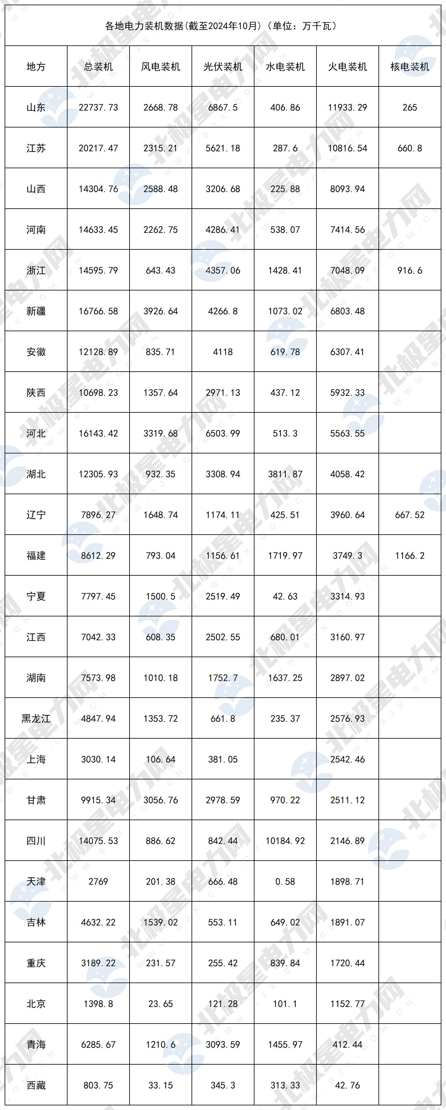 北极星电力网整理了25个省份电力装机数据(截至2024年10月),包括电力总装机、火电装机、水电装机、风电装机、光伏装机、核电装机,整理如下: