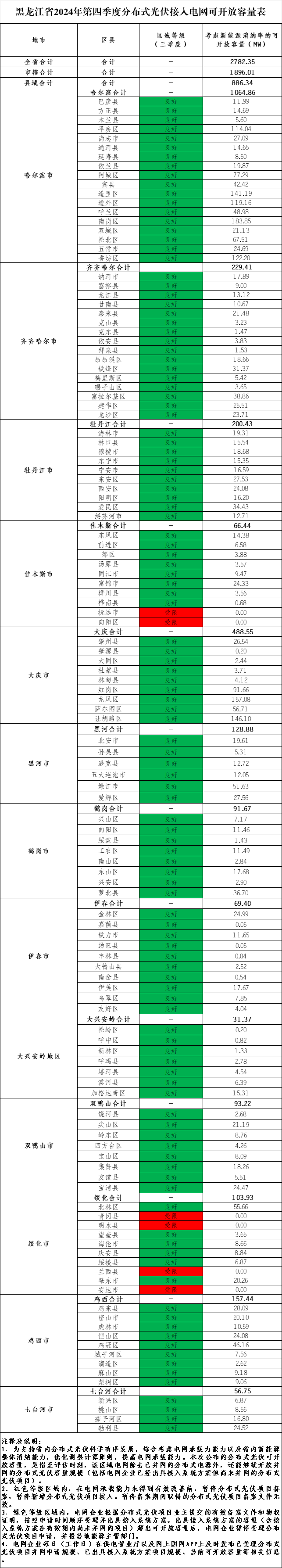 公告显示,黑龙江2024年第四季度电网全省可开放容量2782.35MW,市辖区可开放容量1896.01MW,县域可开放容量886.34MW。其中四季度仅佳木斯市的抚远市、向阳区,绥化市的青冈县、明水县、兰西县、安达市等6个市区接网受限,其他均为绿区。